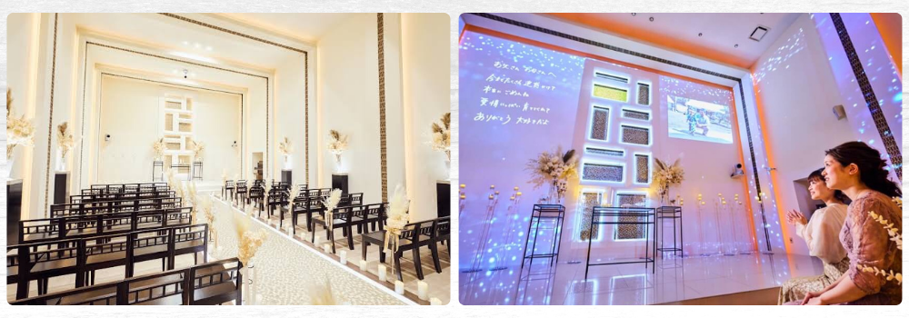 「グラントリア」のチャペルは、幻想的な光と音に包まれながら愛を誓う、感動のステージ。モザイクタイルが輝くバージンロードとモダンな内装が、特別な一日を美しく演出します。